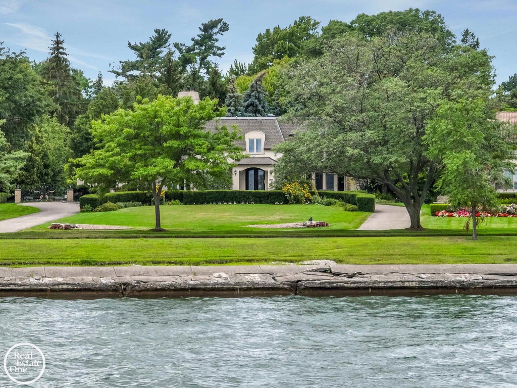 Lake Shore Living! Move right in to this stunning lake front estate in prestigious GP Shores. Enjoy the sunrise each morning and the moon each evening over Lake St. Clair, with breathtaking views from most rooms. This home boasts incredible grand details with a very functional layout. The foyer showcases an intricate custom iron staircase banister, glittering crystal chandelier, marble inlay flooring with matching leaded front door. Custom stained glass throughout. Imported fireplaces in living room, primary suite, and office. Fabulous inlayed African Walnut floors in the living room and dining room. The office and bedroom floors are Brazillian Cherry. The basement is what dreams are made of, bar with banquette seating, billiard area, home theater, wine cellar with fireplace and room for entertaining, and a full spa bathroom with sauna. 3 car attached garage, with adjacent mudroom and laundry. Gorgeous pool and hot tub with mosaic tile. Deck area has pergola with the most spectacular mature wisteria.