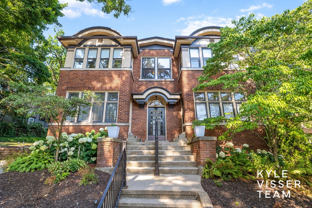 This charming brick ''Chicago flat'' is situated in the heart of the Heritage Hill Historic District in Downtown Grand Rapids. The largest unit of the 5 unit building, this 3-bedroom, 2-bathroom condo boasts a spacious primary suite with stylish exposed brick, a private bath, and a huge walk-in closet. The open-concept living area, featuring a bright and airy living room, dining room, and kitchen, is perfect for entertaining. Two additional bedrooms and a full bath complete this beautiful residence. The unit includes a one-stall garage and additional off-street parking. Outside, enjoy the shared garden spaces, patio, and grill area. Just a short distance from downtown dining and entertainment, this home offers unbeatable city access in a picturesque neighborhood setting.