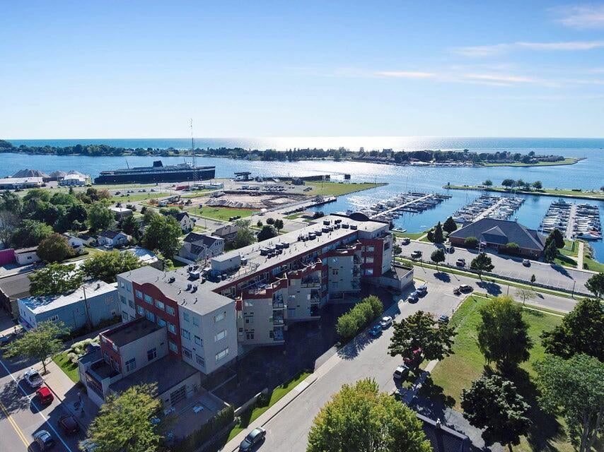 Harbor Terrace Condominium - Enjoy a WEST facing view that offers captivating waterfront views, looking straight down the channel to Lake Michigan, with stunning sights of the lighthouse, marina, and the iconic SS Badger.This unique two-story, loft-style condo blends historic charm with modern comfort. Soaring 12-foot ceilings, exposed concrete pillars, and an open floor plan create a bright and welcoming main level, featuring the kitchen, dining, and living areas, ideal for both entertaining and everyday living. A half bath and laundry room complete the first floor.Upstairs, accessible via a charming spiral staircase or directly from the third-floor hallway (with convenient elevator access), you'll find a second living area, three bedrooms,and two full bathrooms, offering space for family, guests, or work-from-home needs.